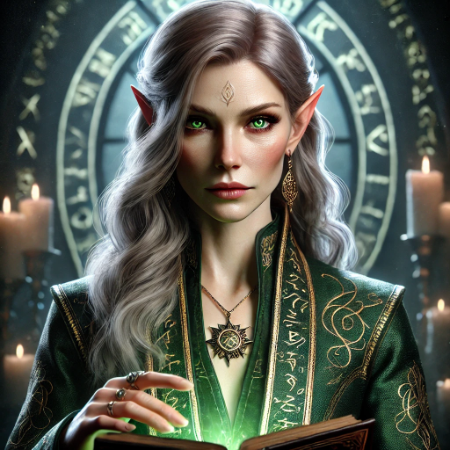Lirien Ashthorne is a slender, sharp-eyed elf with silver-streaked black hair and intricate arcane tattoos tracing her arms. She wears flowing dark-blue robes embroidered with glowing runes, and her fingers are often stained with ink from her relentless studies.