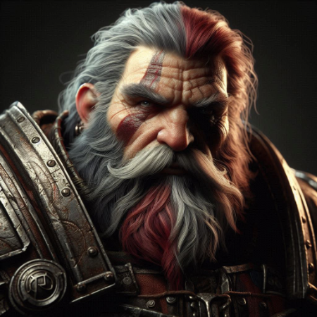 Sir Gideon Vale is a towering, battle-worn warrior with streaked red-and-white hair and a deep scar across his face. His sharp gray eyes hold the weight of experience, and he wears well-worn plate armor bearing the sigil of W.O.R.M. His longsword, Dawnbreaker, glows faintly, its edge never dulling despite years of combat.