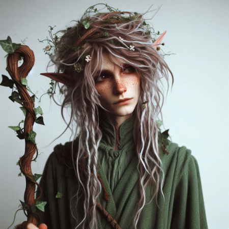 A tall, slender elf with silver-streaked auburn hair woven with small vines and flowers. Her emerald-green robes shift like leaves in the wind, and her deep brown eyes hold the wisdom of centuries. A carved wooden staff, entwined with living ivy, never leaves her side.