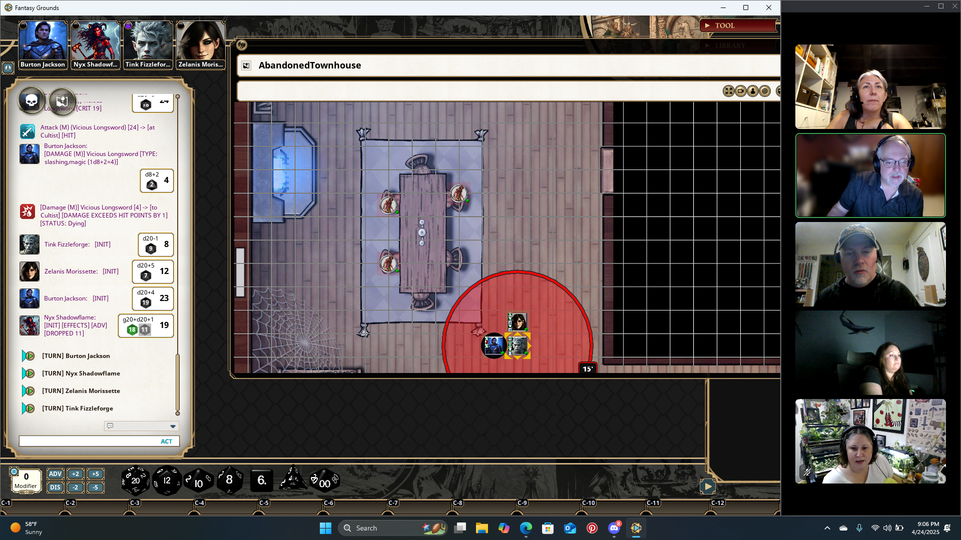 When dusk falls, Burton casts charm on Gerrin. Then Gerrin leads the party to the cultist location. When the door is opened, Zelanis stops playing possum and the party attacks. Inside the house there are more cultist. The party kills all the cultists; leaving two of them unconscious, but alive.