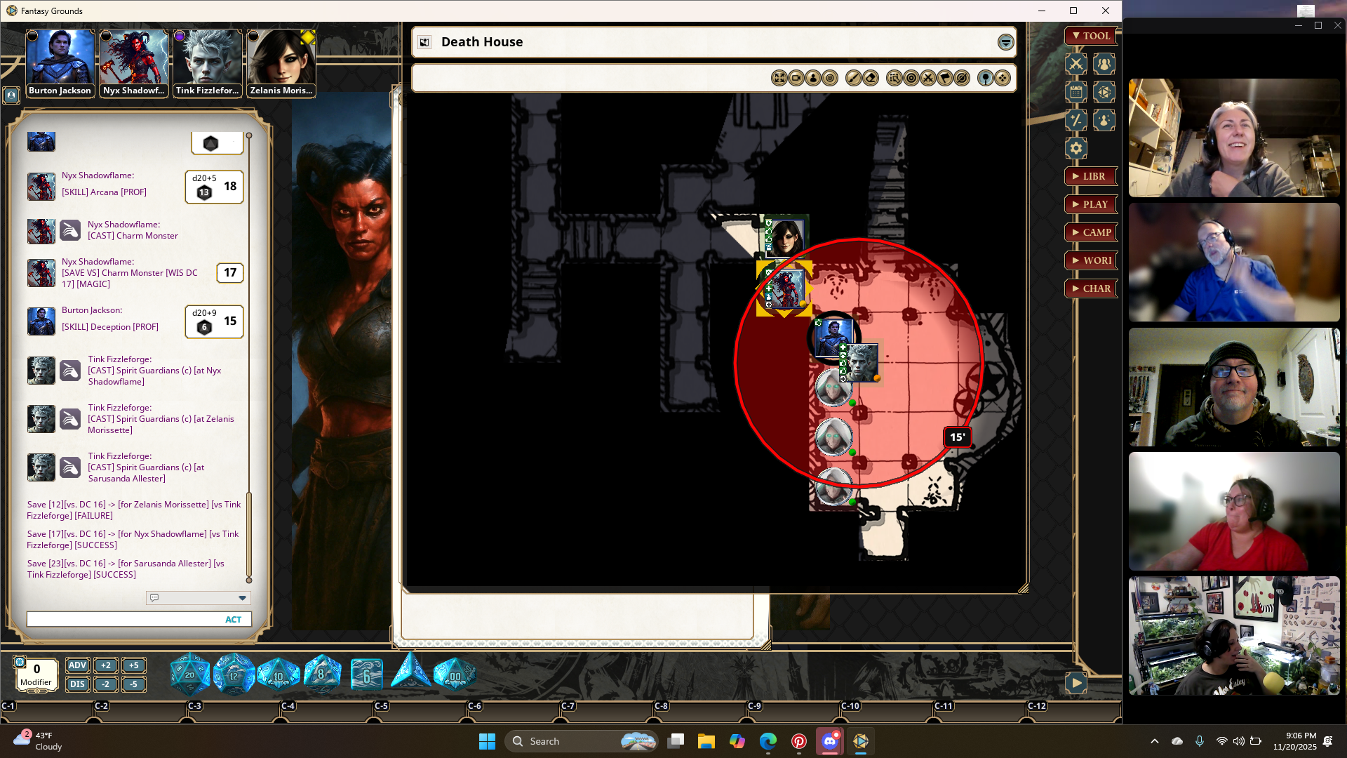 The party eventually ask "Sandy" for suggestions. "Sandy" asks if anyone in the party has true sight. Zel remembers that she has a Gem of Seeing. She gives it to Tink. Tink uses it and deduces that his coffin is an exit and he must lay down in the coffin to activate it. The rest of the party digs up their own graves to find coffins. Burton refuses to dig up and lay down in his own coffin. The rest of the group digs it up for him and Nyx persuades Burton to lay down.