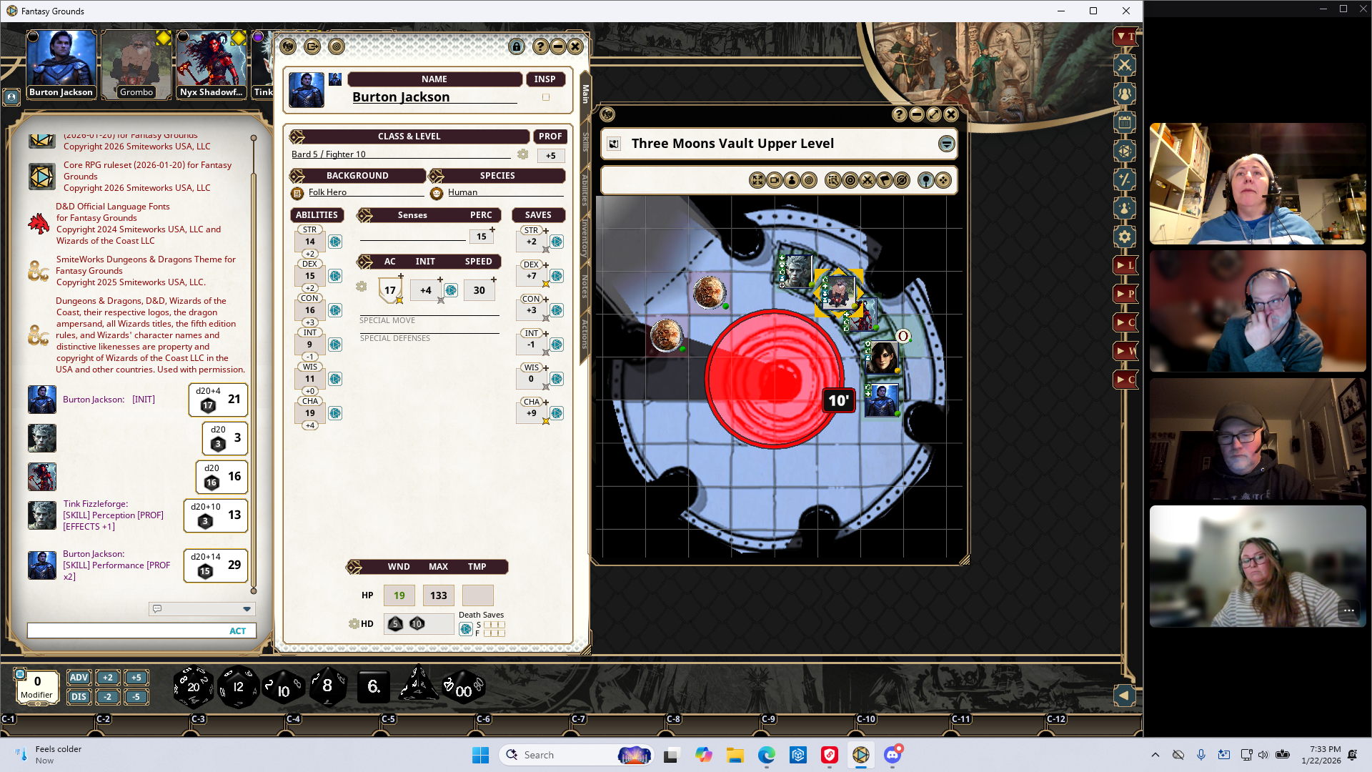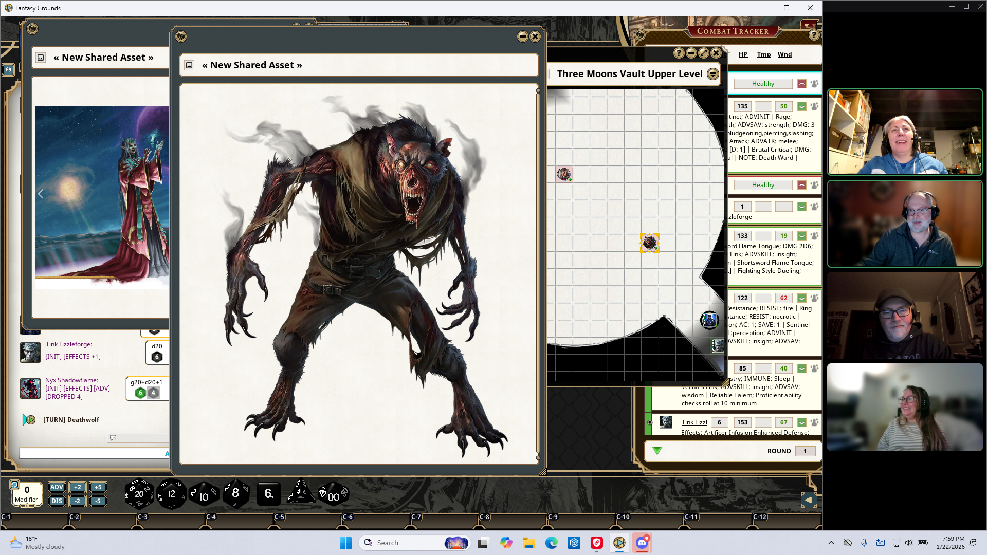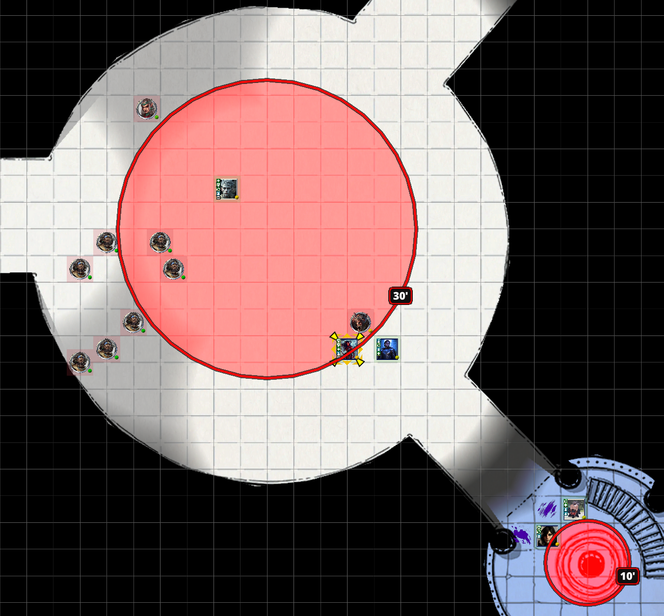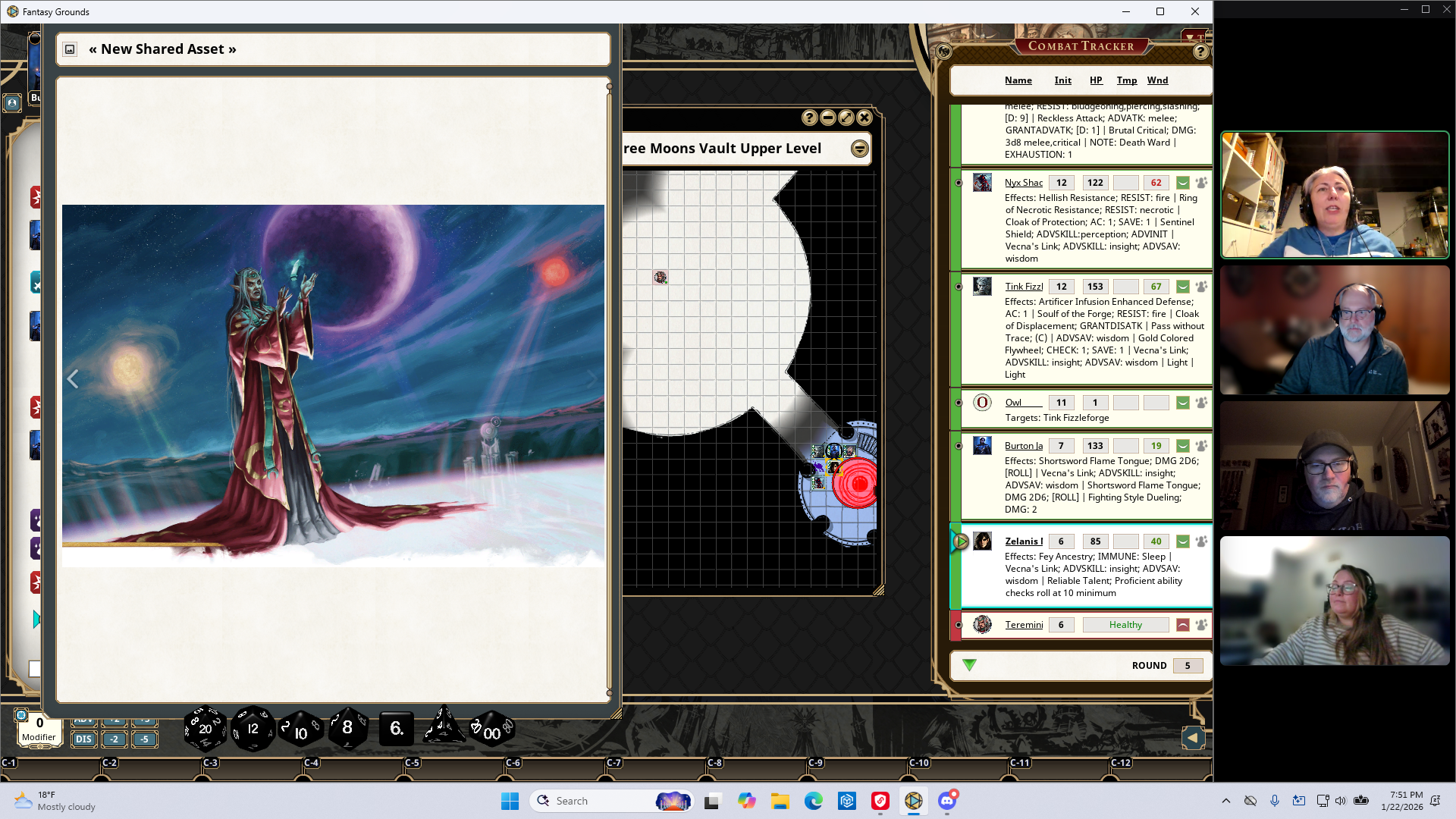 The guards begin shooting heavy crossbolts at the party. Zel takes out more mirror panels. Burton heals the party. Grombo takes out the deathwolf. Burton and Nyx take healing potions. Zel destroys another mirror panel. Grombo is pissed and goes into a Frenzy. He attacks Termini and disrupts her concentration. Tink is returned to their current plane of existence. Termini teleports to the other side of the moondisk.