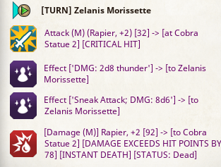 The party quickly heads back and uses the Arcane Gate before the spells ends. Tink tries to stealthily move through the serpent chamber, the two cobra statues attack. The party works together to quickly take down the cobra statues. Zel crits again (92 points of damage) and takes out the first statue. Tink takes out the second statue.