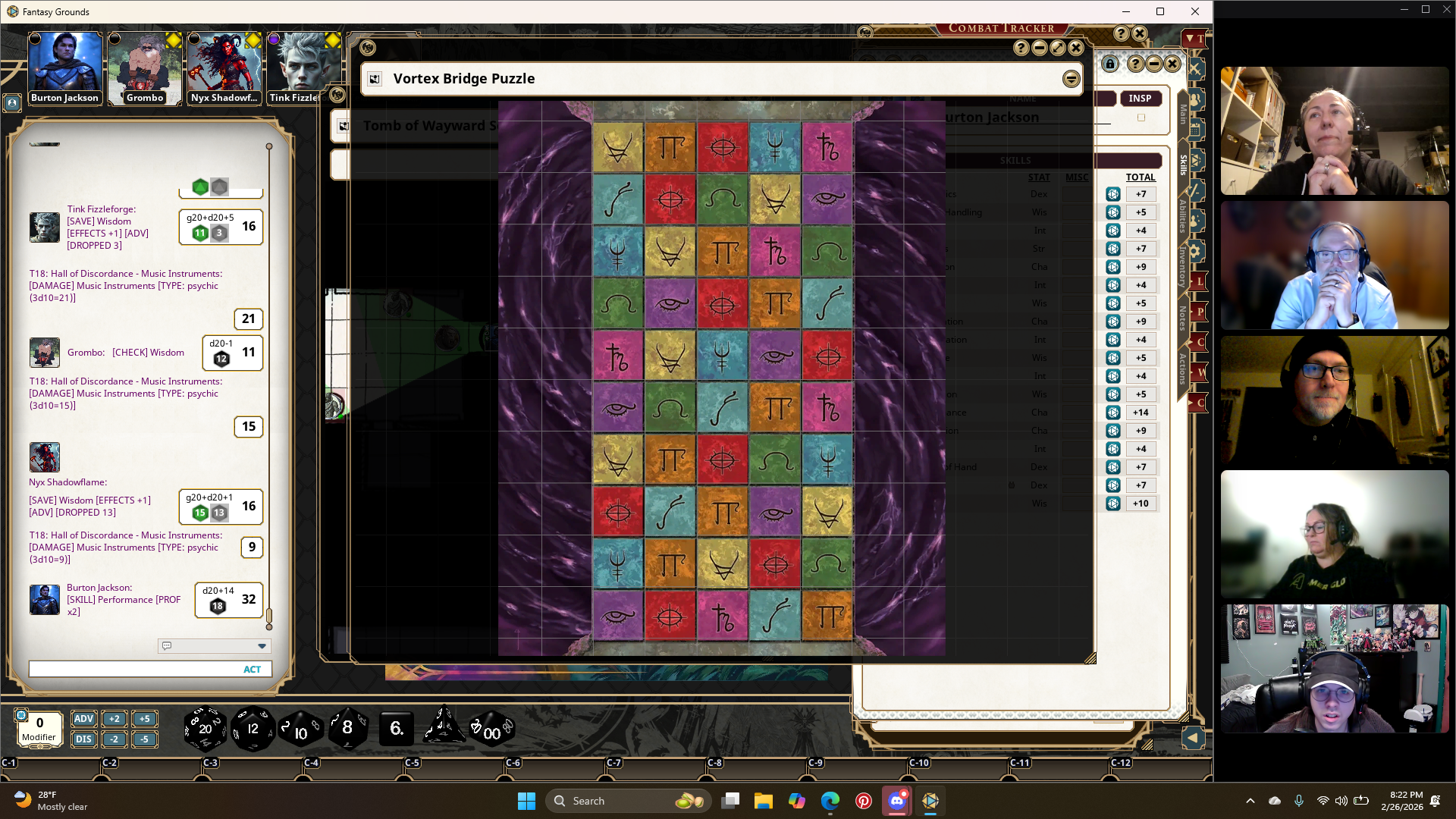 The next room consists of a bridge covered in engraved colored tiles, below is a pitch-black vortex. The party works together to figure out that they must only step on the red evocation tiles. Everyone crosses the room safely with ropes tied between everyone.