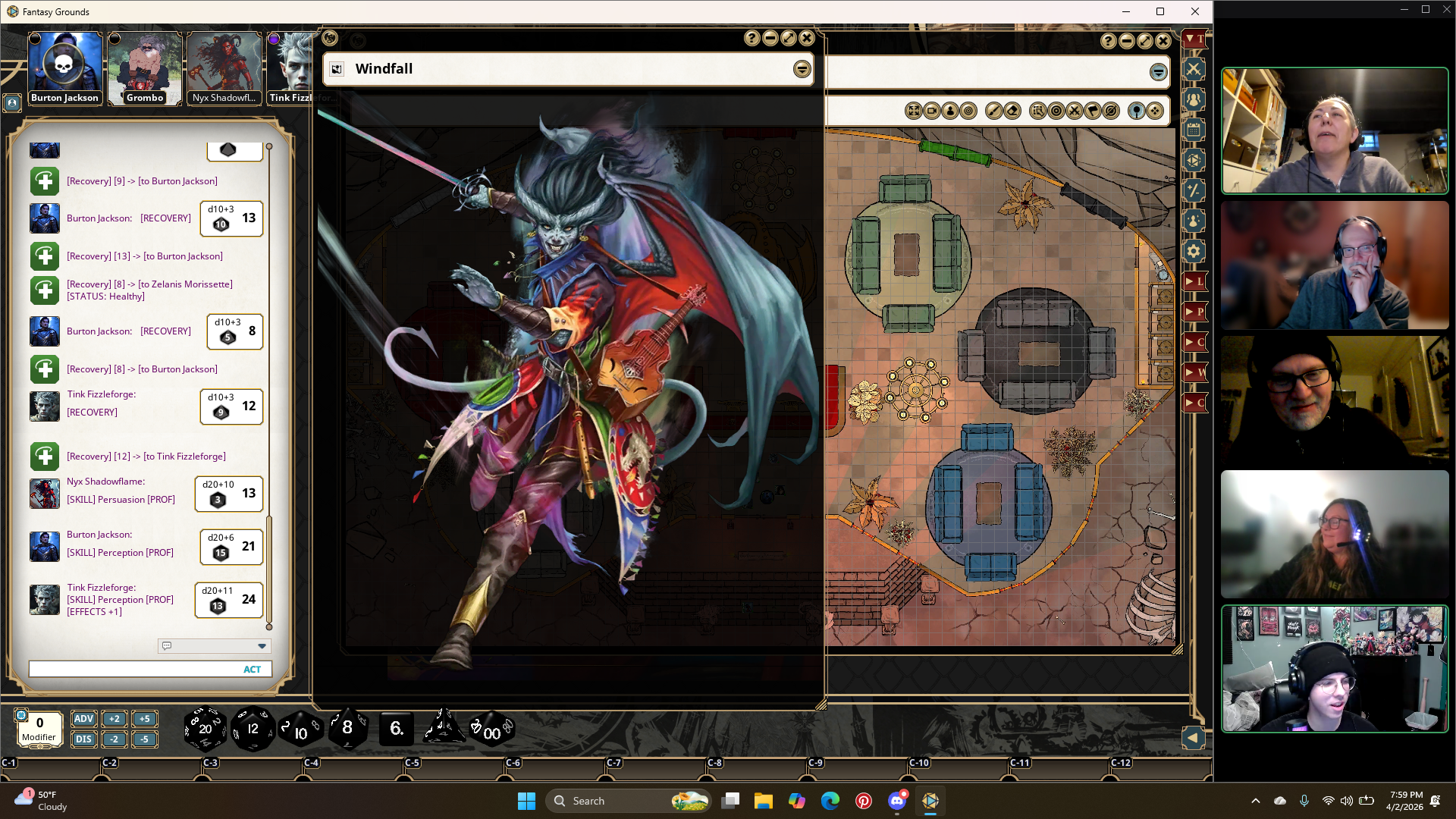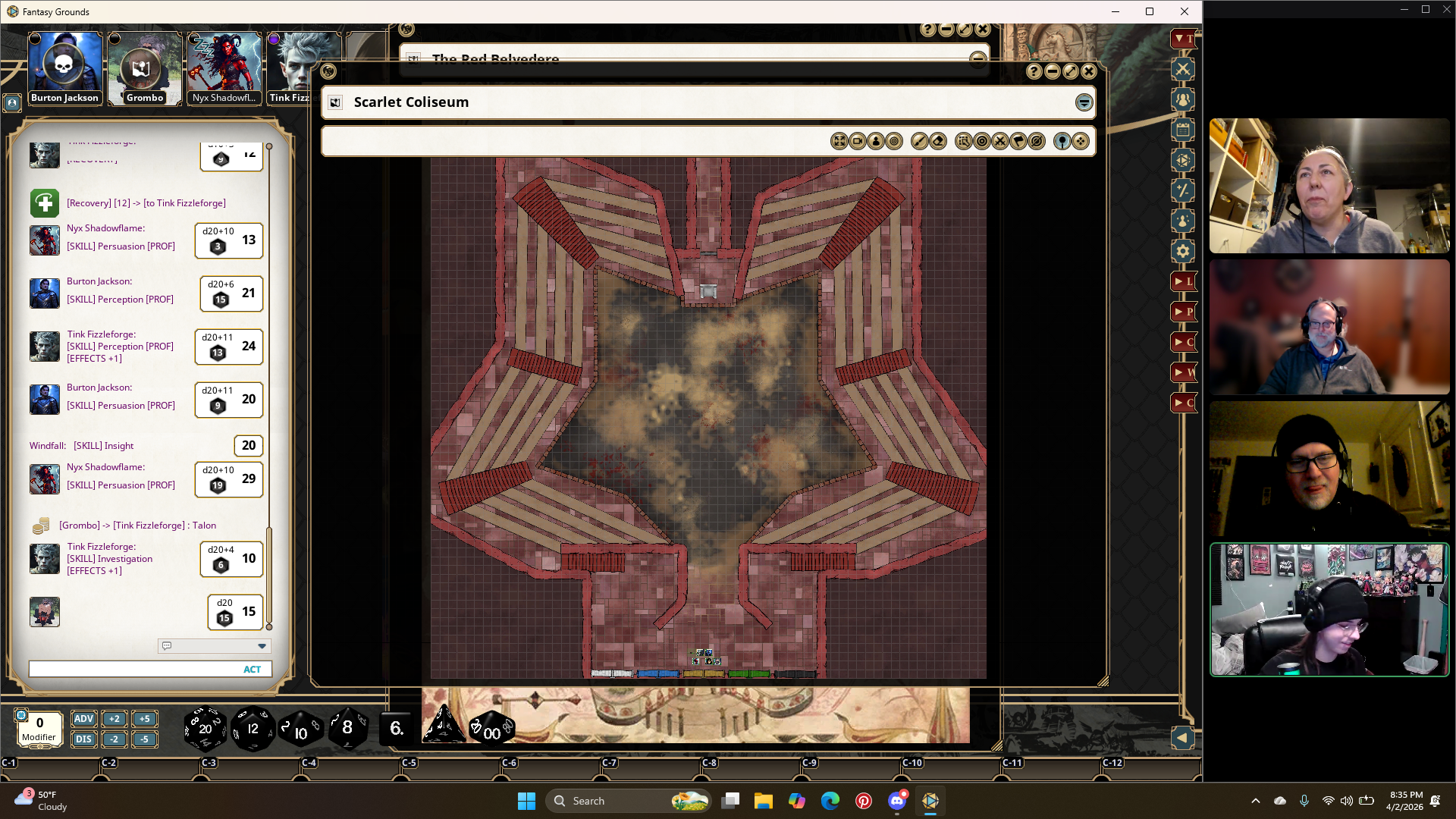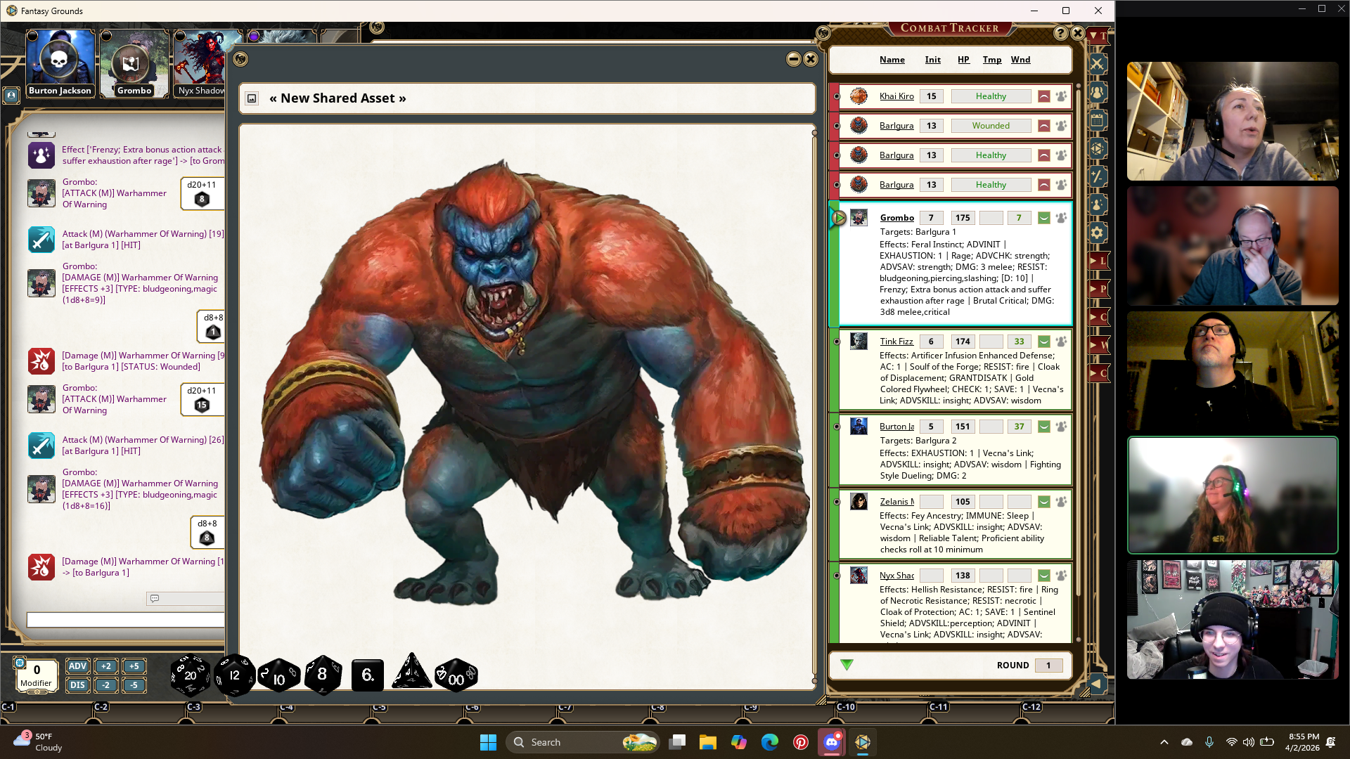 Burton, Tink, and Grombo face off against three Barlguras. The match is quickly ended, but the party members are wounded. It costs talons to leave the match early, but one of the party members can pay to swap in. There is an hour break for the players to heal. Nyx gives Grombo her Potion of Vitality to remove his Exhaustion.