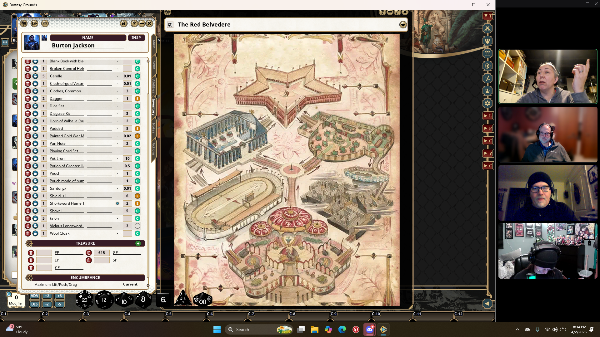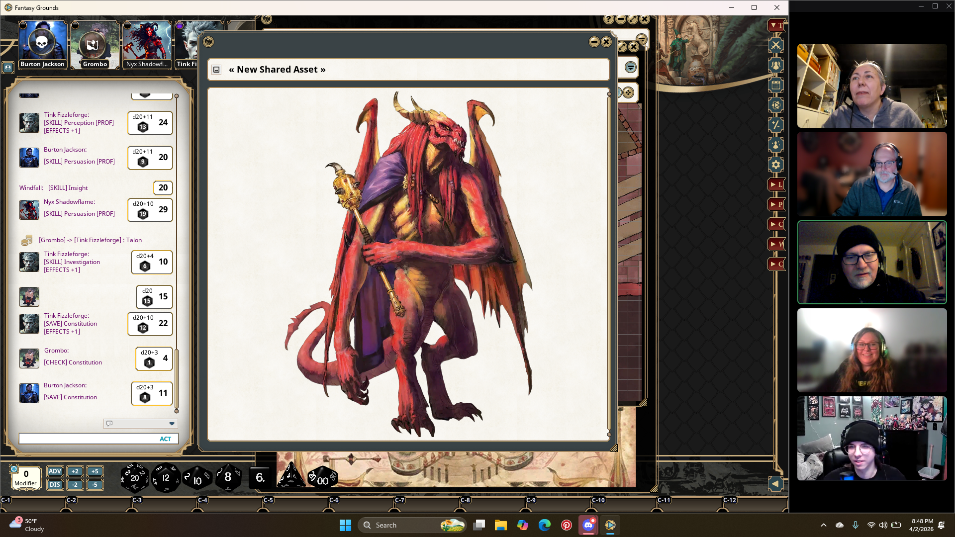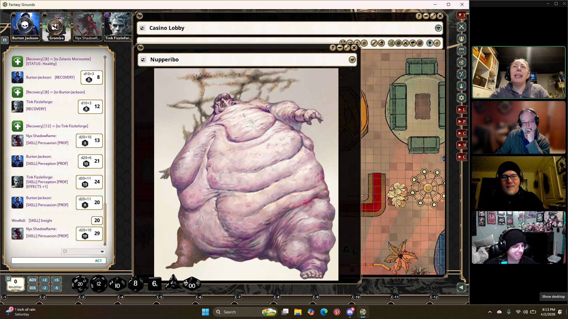 Burton, Tink, and Grombo face off against three Barlguras. The match is quickly ended, but the party members are wounded. It costs talons to leave the match early, but one of the party members can pay to swap in. There is an hour break for the players to heal. Nyx gives Grombo her Potion of Vitality to remove his Exhaustion.