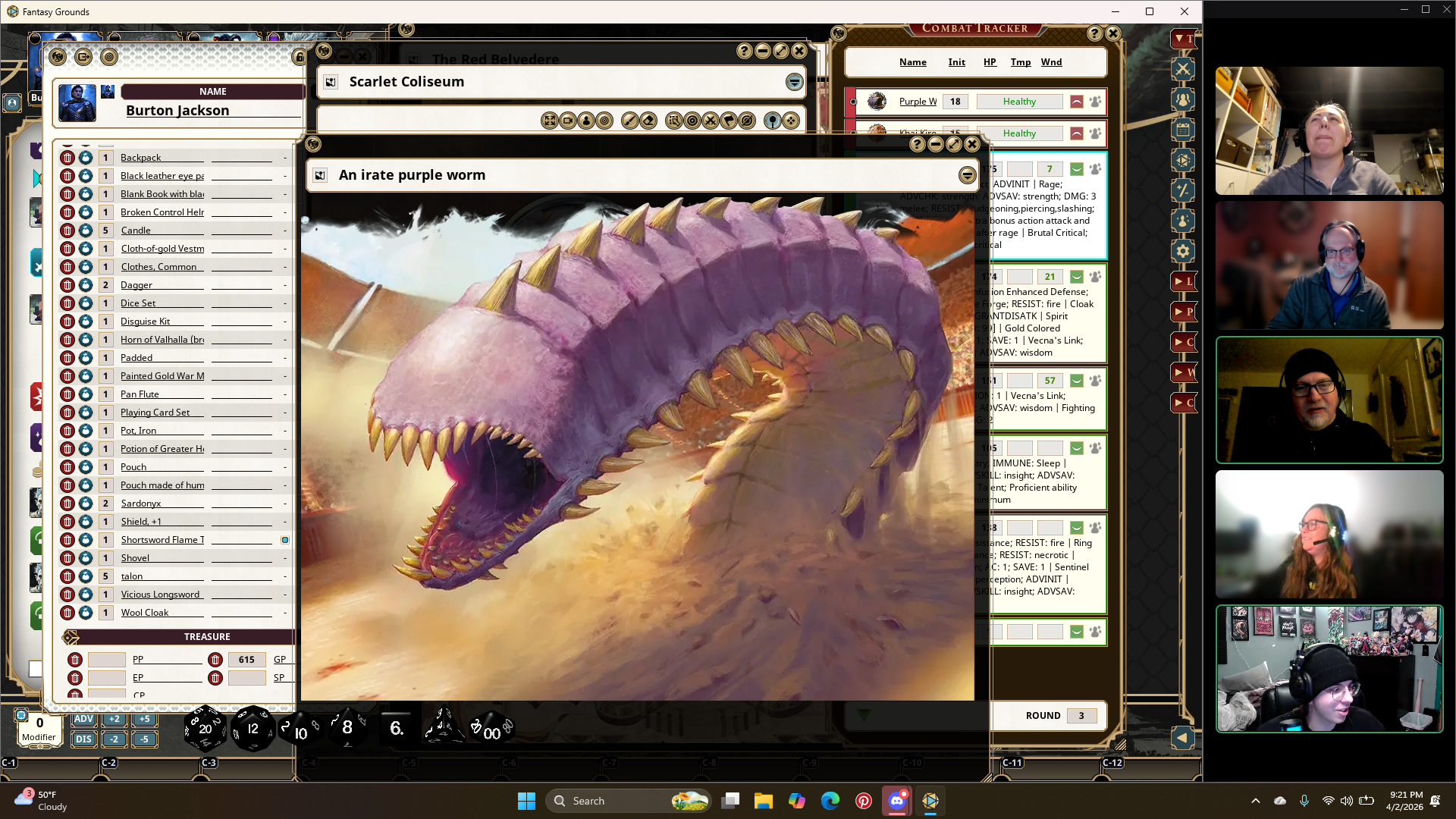 The second round in Tink, Zel, and Nyx. The pit boss announces their next opponent and a gargantuan Purple Worm erupts from the arena floor. Burton and Grombo place a bet of 300 talons on their friends as the watch from the stands.